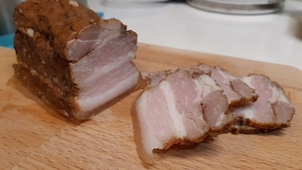 烤箱烘乾:基本上放在冰箱就是逐步風乾的過程,不過要存放的久,還得更乾燥一些。將培根用錫箔紙包好,送烤箱(100度即可)低溫烤製約1-2小時,途中肉汁會溢出,香味四溢,烘的差不多後,不要打開錫箔紙,讓肉汁和培根一起放涼,再放置乾淨的保鮮袋或盒中,送冰箱冷藏。隔天取出分切,沒有馬上吃的就送冷凍保存,任務完成。基本上培根此時的狀態是半熟的,還是需要再加熱將肉品熟透喔。